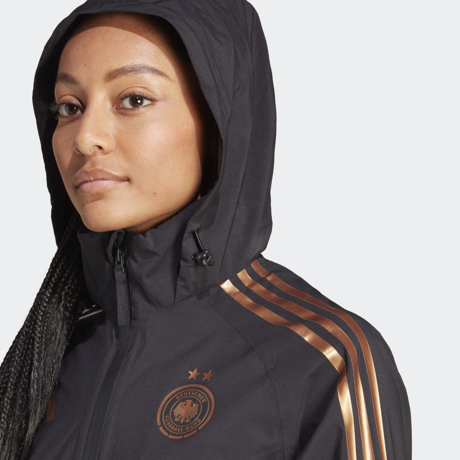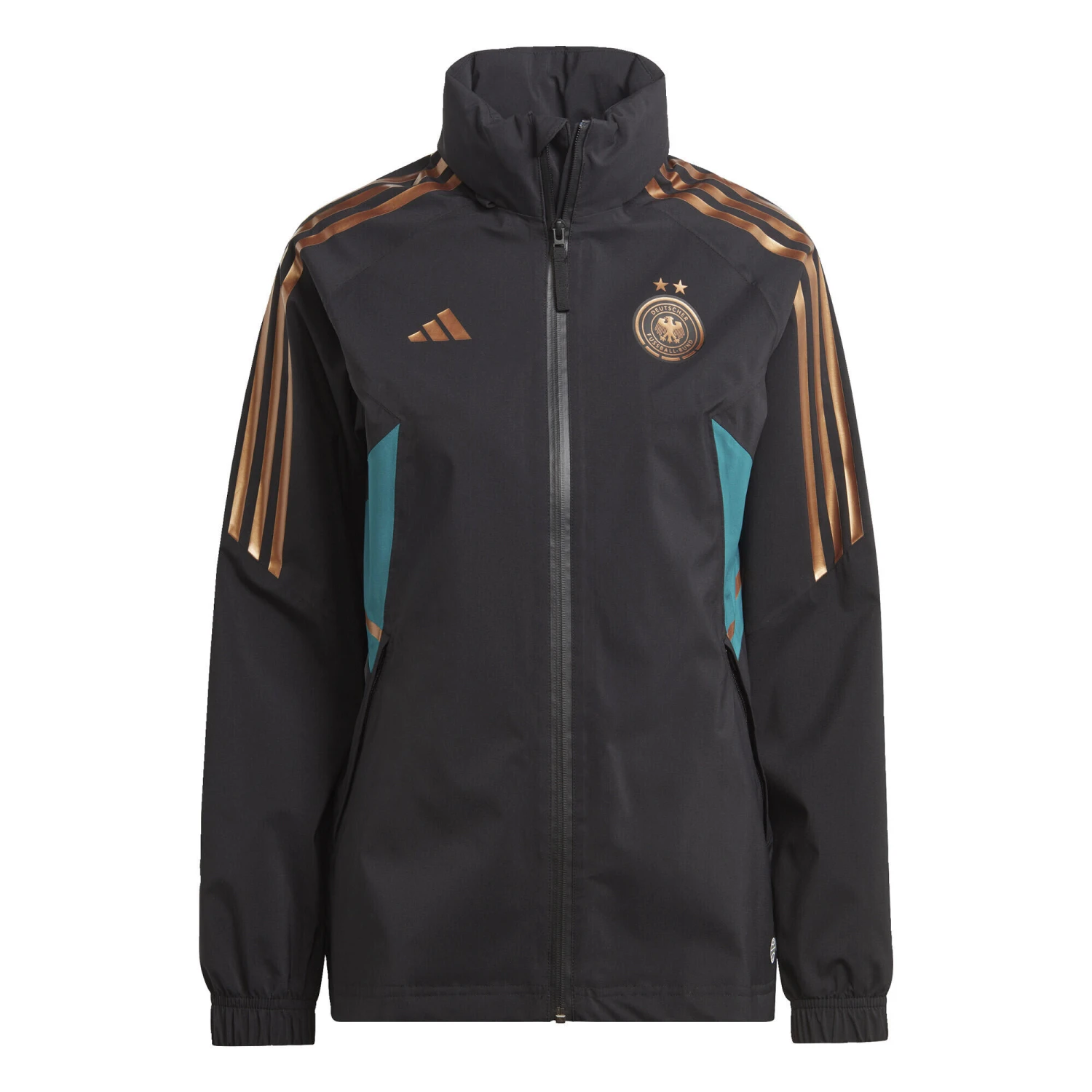 Be laser-focused on the pitch while you rep Germany’s colours in this adidas jacket. Sealed seams and RAIN.RDY keep the rain and wind at bay so you stay dry and comfortable. Flip up the hood when it starts to pour or pack it away once the sun shines again. Gold details throughout give the jacket a standout look worthy of football royalty.Made with 100% recycled materials, this product represents just one of adidas’ solutions to help end plastic waste.