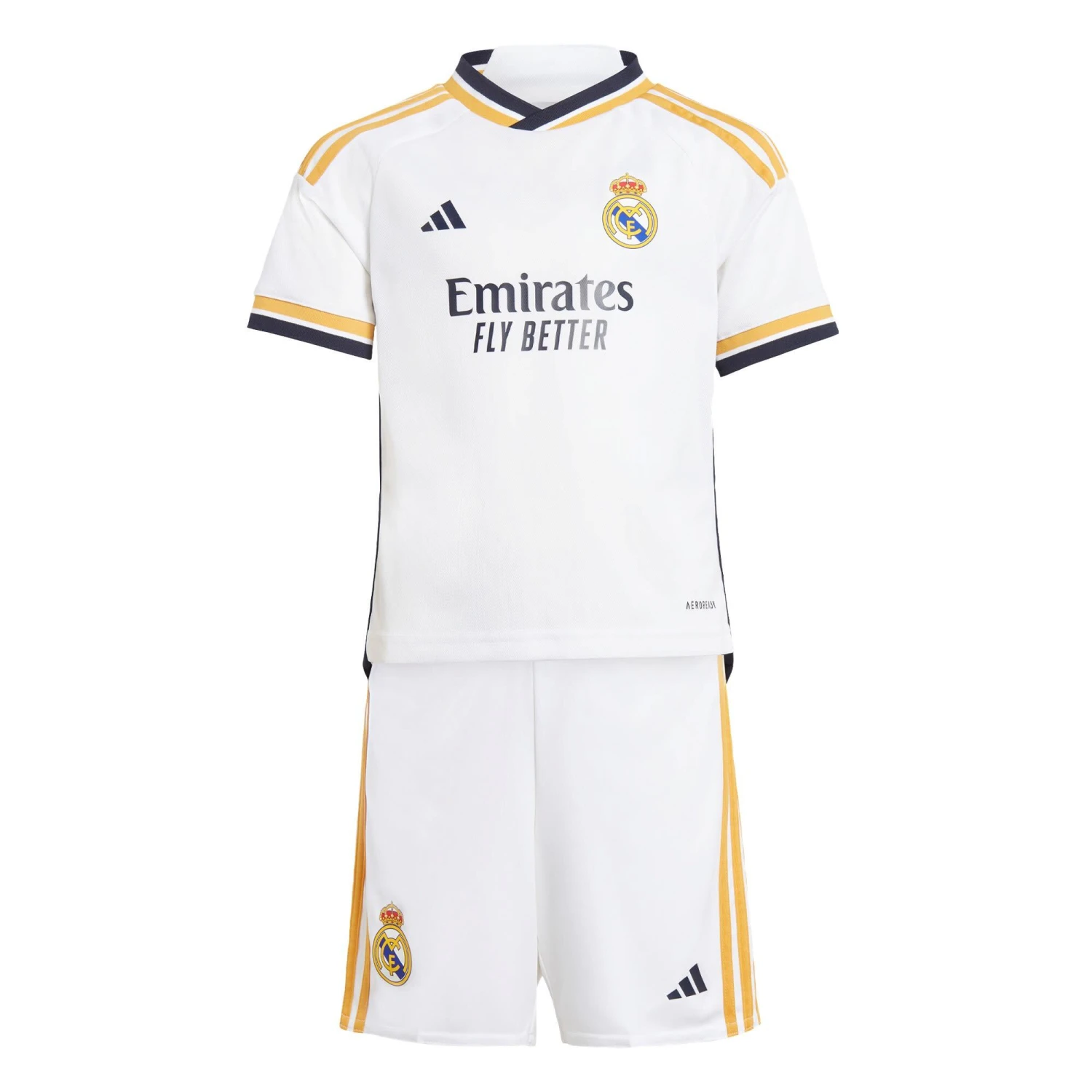 For most football teams, winning is everything. For this one, it’s part of a grander design. Like the club it represents, this kids’ adidas Real Madrid kit stands for elegance and style. It includes supporter versions of the timeless jersey and shorts the players wear, as well as a pair of crew-length socks. AEROREADY ensures young fans always feel comfortable in those famous white colours.Made with a series of recycled materials, and at least 70% recycled content, this product represents just one of adidas’ solutions to help end plastic waste.
