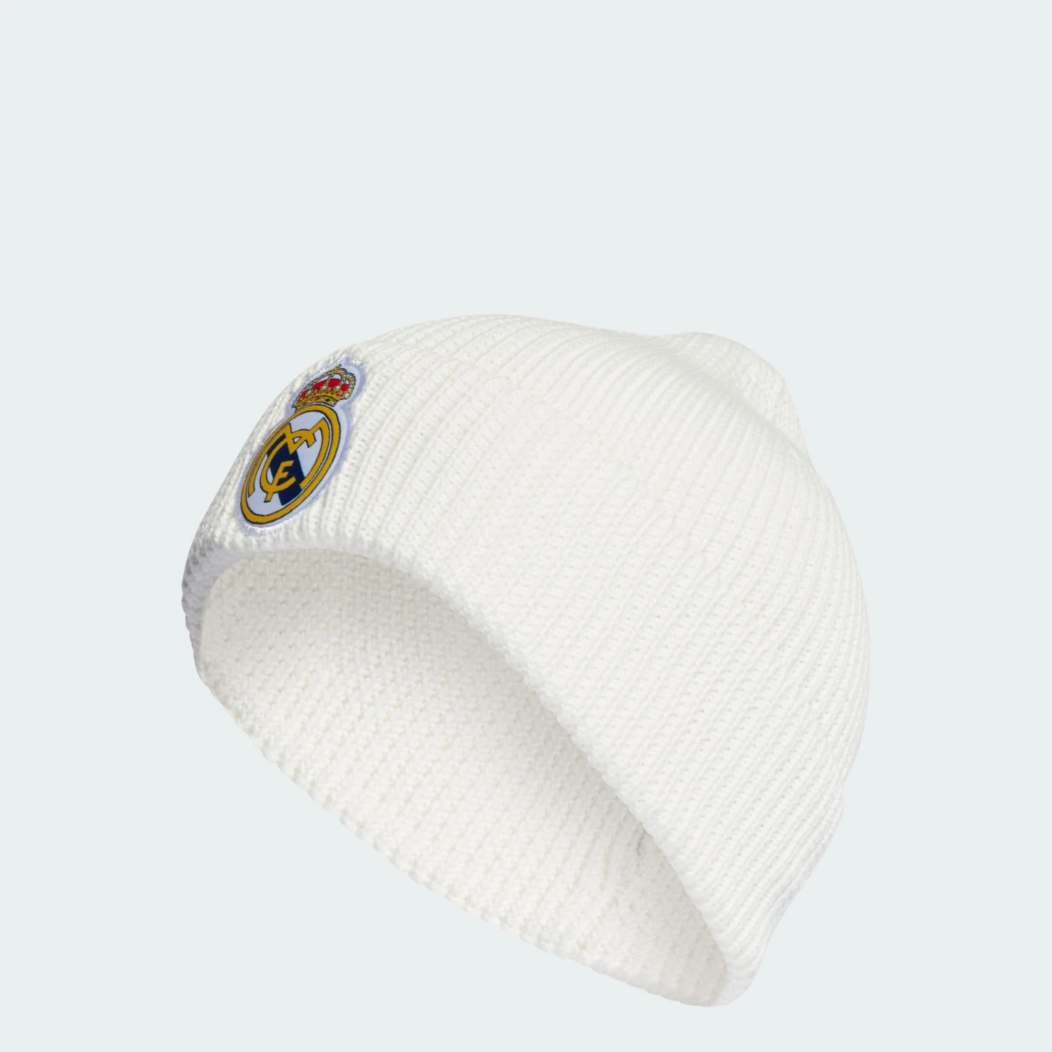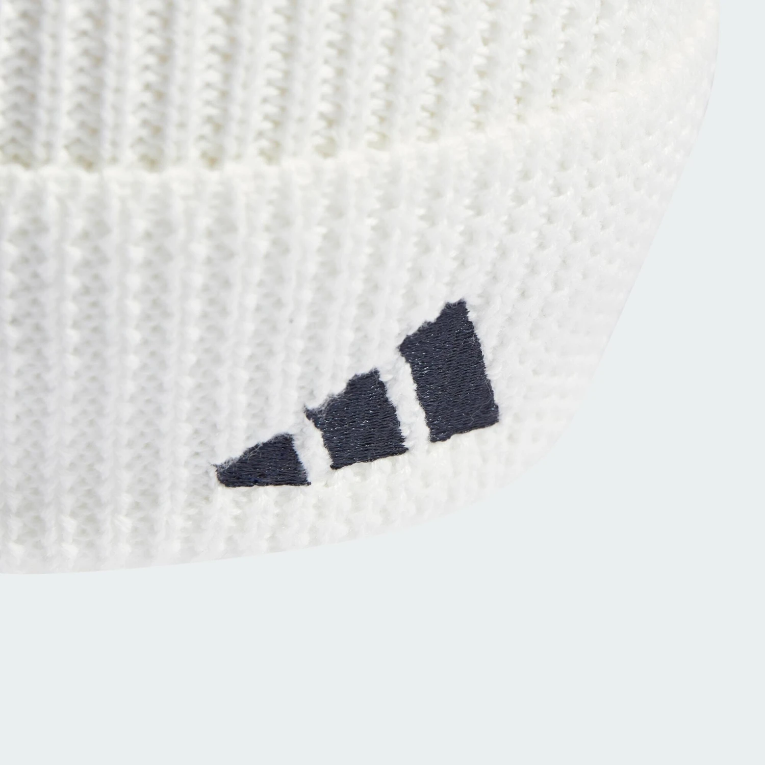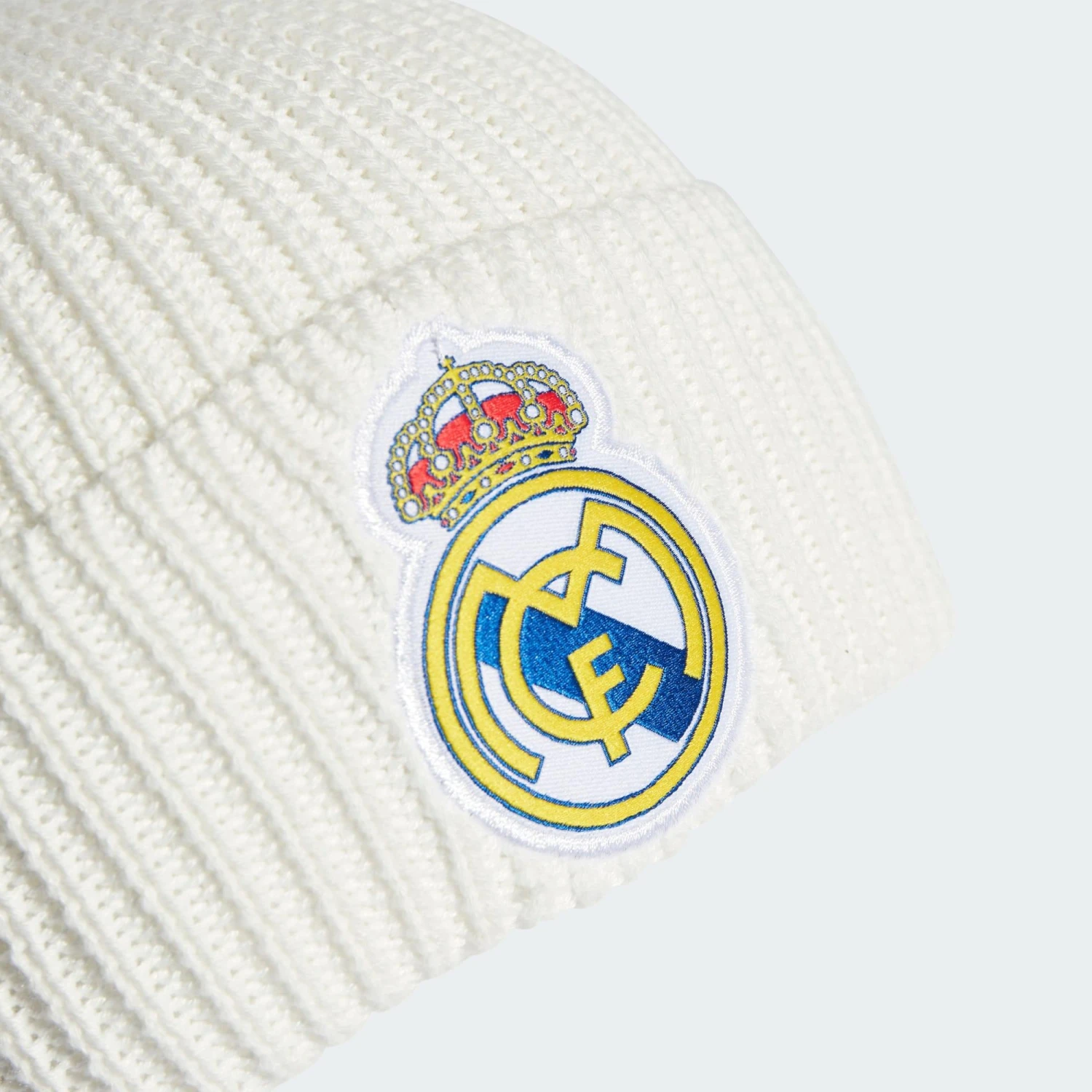 A symbol of football excellence. Woven onto the fold-up cuff of this adidas Real Madrid beanie, Real Madrid’s badge stands out over those famous white home colours. This hat’s soft plain knit construction makes it perfect for pulling on when you’re backing your team during chilly evening games.Made with a series of recycled materials, and at least 40% recycled content, this product represents just one of adidas’ solutions to help end plastic waste.