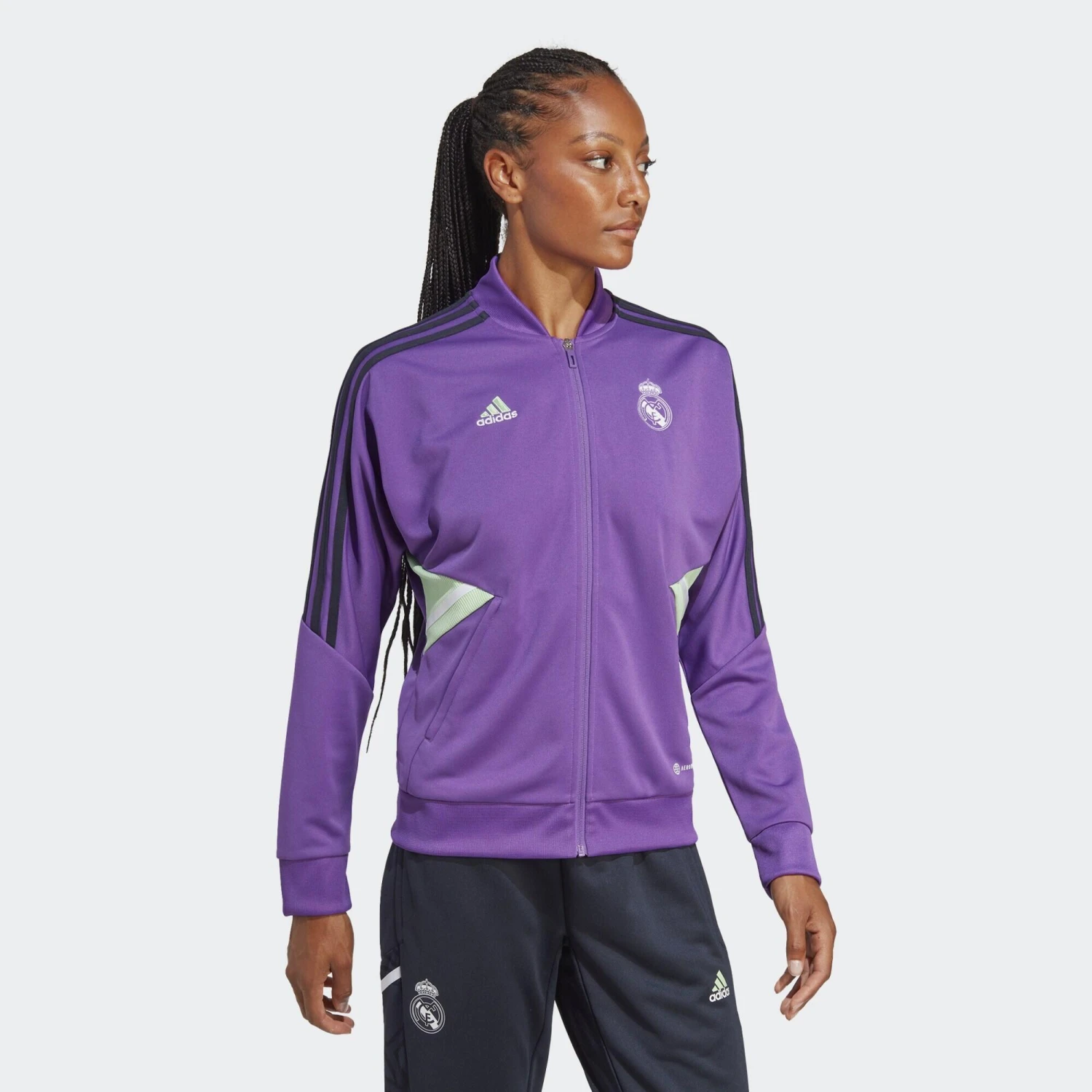 A chilly day at the Bernabéu or just a night out with friends. This adidas Condivo football jacket looks equally at home for either. AEROREADY keeps moisture off your skin so you stay dry. The full zip and stand-up collar add extra coverage. The club badge lets the world know you support Real Madrid.Made with 100% recycled materials, this product represents just one of adidas’ solutions to help end plastic waste.