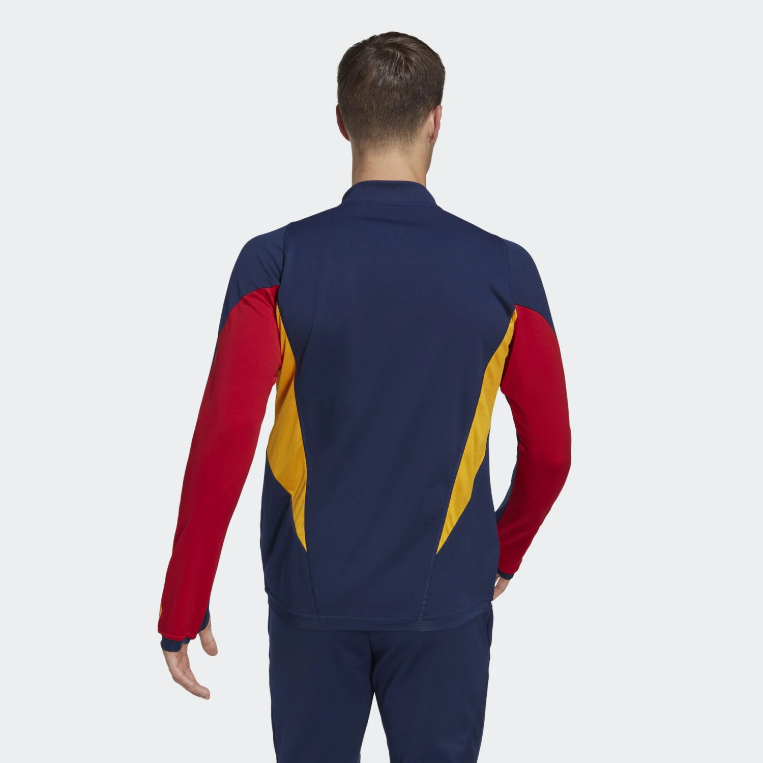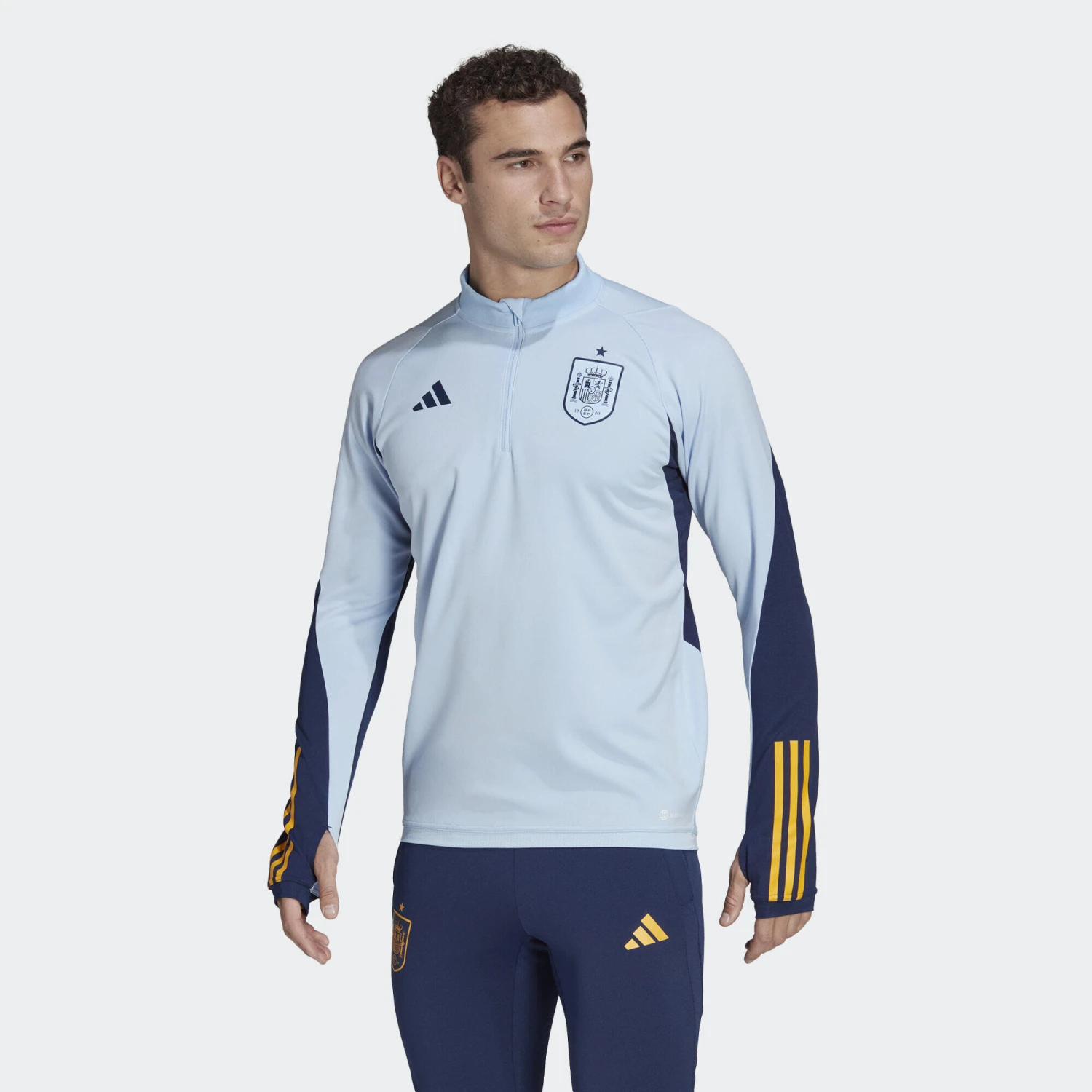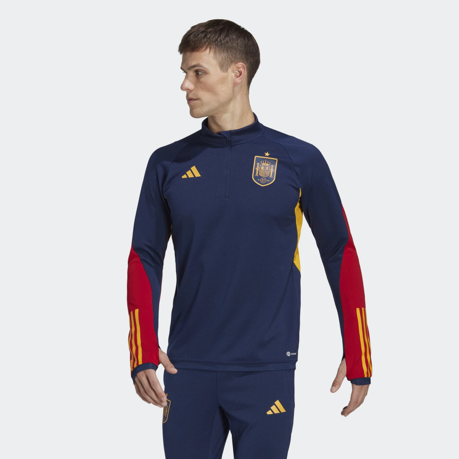 Powered by the belief of a nation. Spain players push their limits in training with the help of this adidas football top. Breathable mesh inserts, moisture-absorbing AEROREADY and a streamlined silhouette combine to keep them flying session after session. A quarter zip means it’s easy to rip off and throw to one side when you’re on the run.Made with 100% recycled materials, this product represents just one of adidas’ solutions to help end plastic waste.