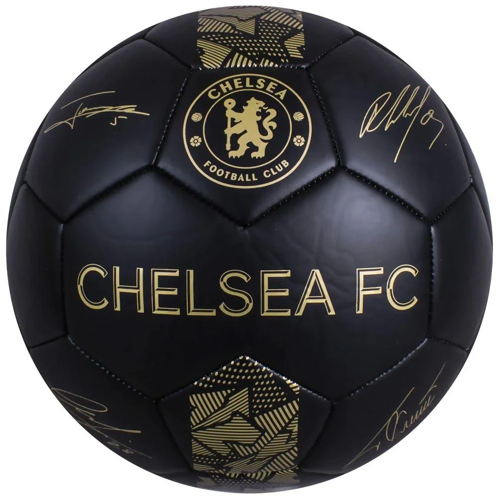 The Chelsea FC Phantom Signature Football is a must have for football fans. This ball is back and updated with gold team accents that really stand oout on this ball. Stitched panel upper with internal air retention bladder with added team logo details and player signatures signatures all over teh outer. Official team merchandise.