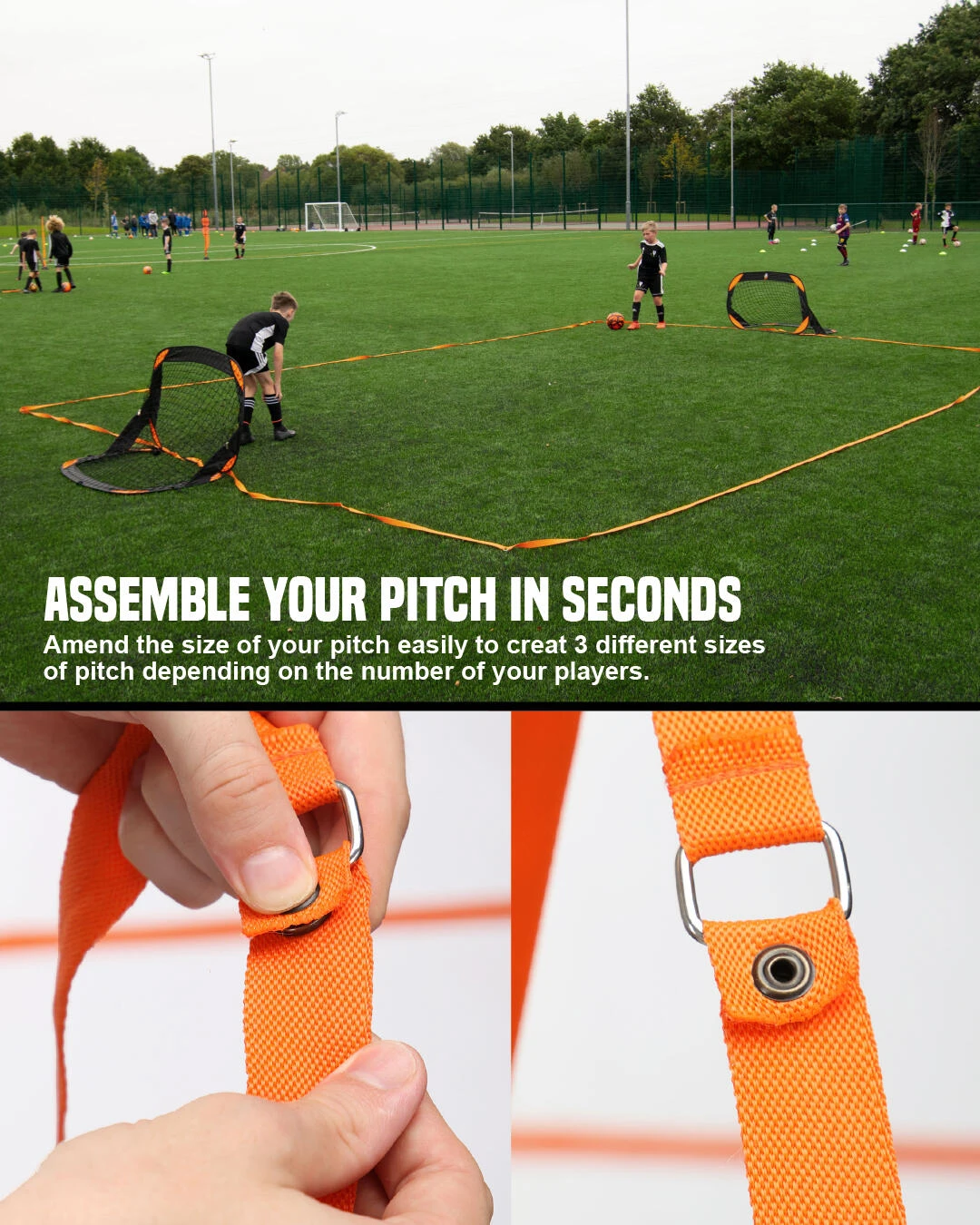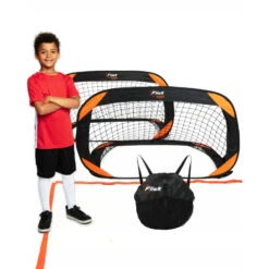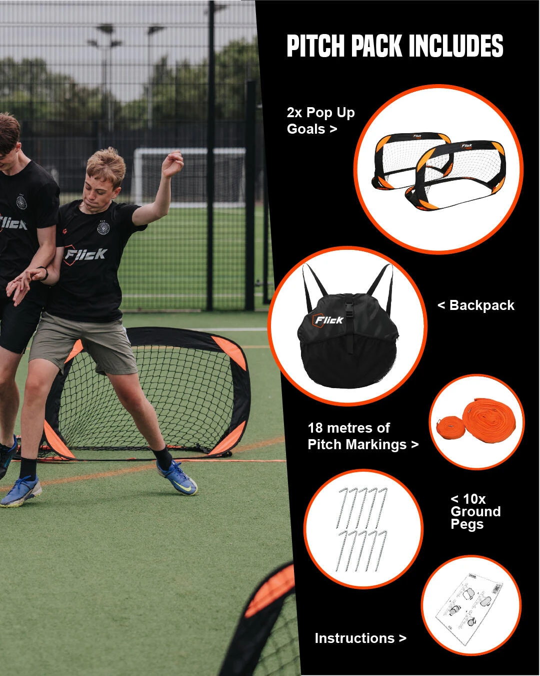 Everything You Need – this portable Pitch Pack set contains 2 x compact pop up goals, adjustable pitch marker, pegs and a backpack. Take your football pitch with you everywhere.