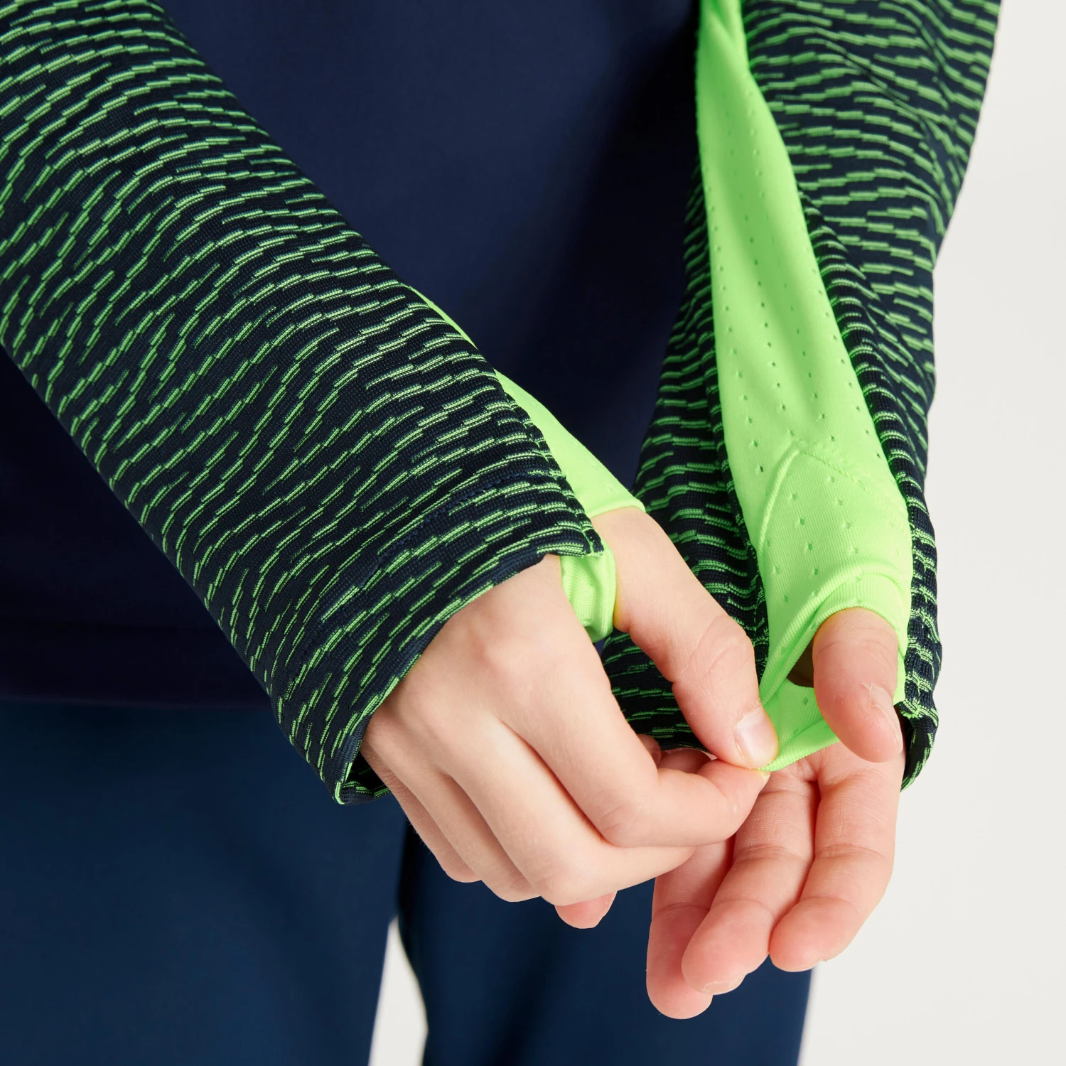 The CLR children’s 1/2 zip sweatshirt features a polyester-elastane blend for stretch in every direction. The fitted cut fits like a second skin. It’s lightweight, so it can be forgotten about during training or warm-up. With the CLR sweatshirt, you’re free to show off all your favourite skills unhindered. The thumb loops ensure that the sweatshirt stays in place during all your movements.