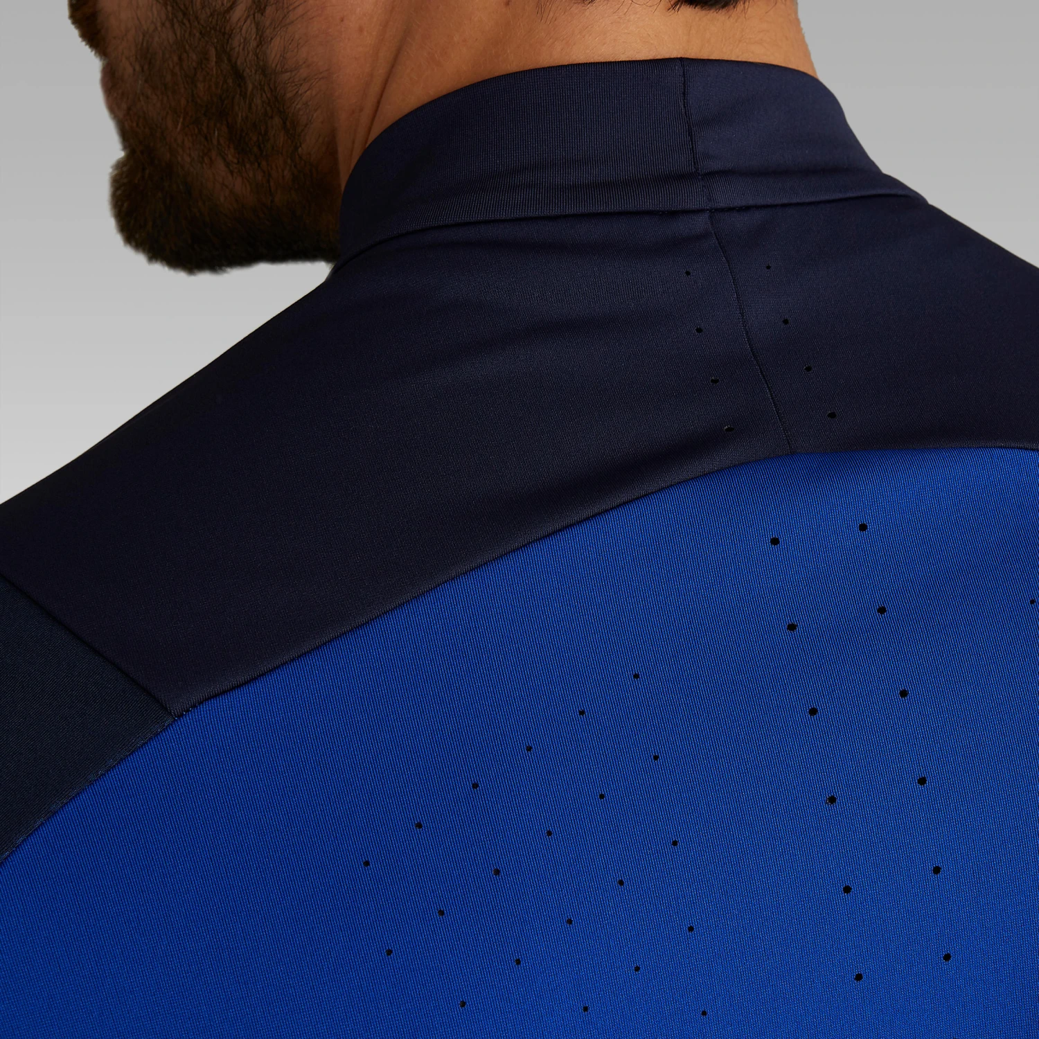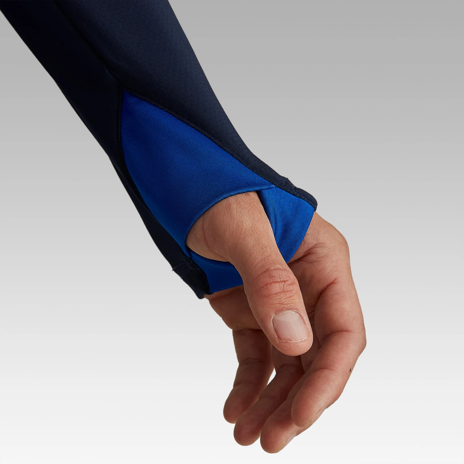“It all started with this desire to move the zip and have a shifted half-zip, with maximum comfort for chest traps while also protecting the neck from the cold. The other challenge was to make the thumb loop an option. If you don’t use it, it’s invisible in the sleeve. Lastly, the honeycomb fabric reacts to the player’s movements: visually it looks right at home. You feel good wearing it, a bit like a superhero.”