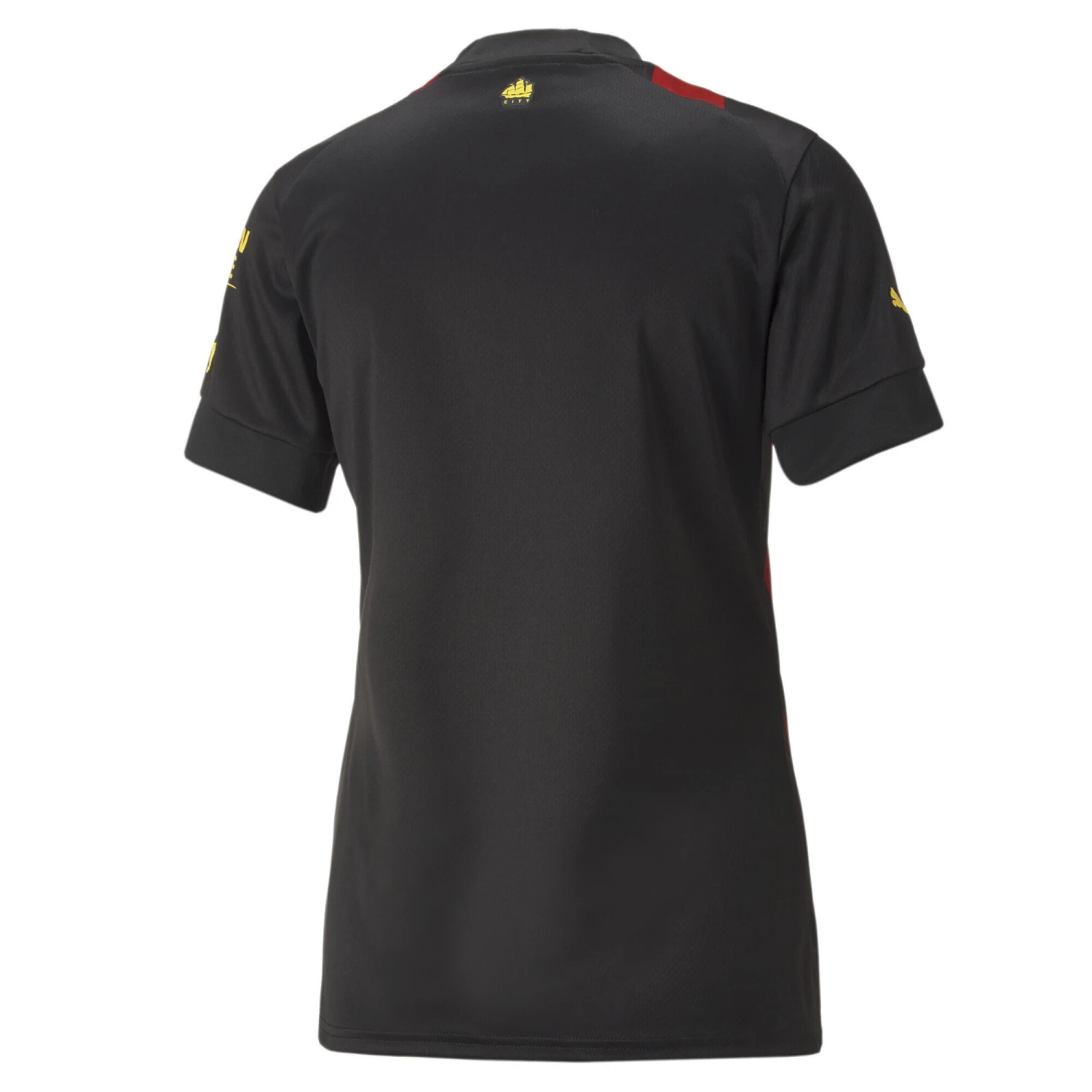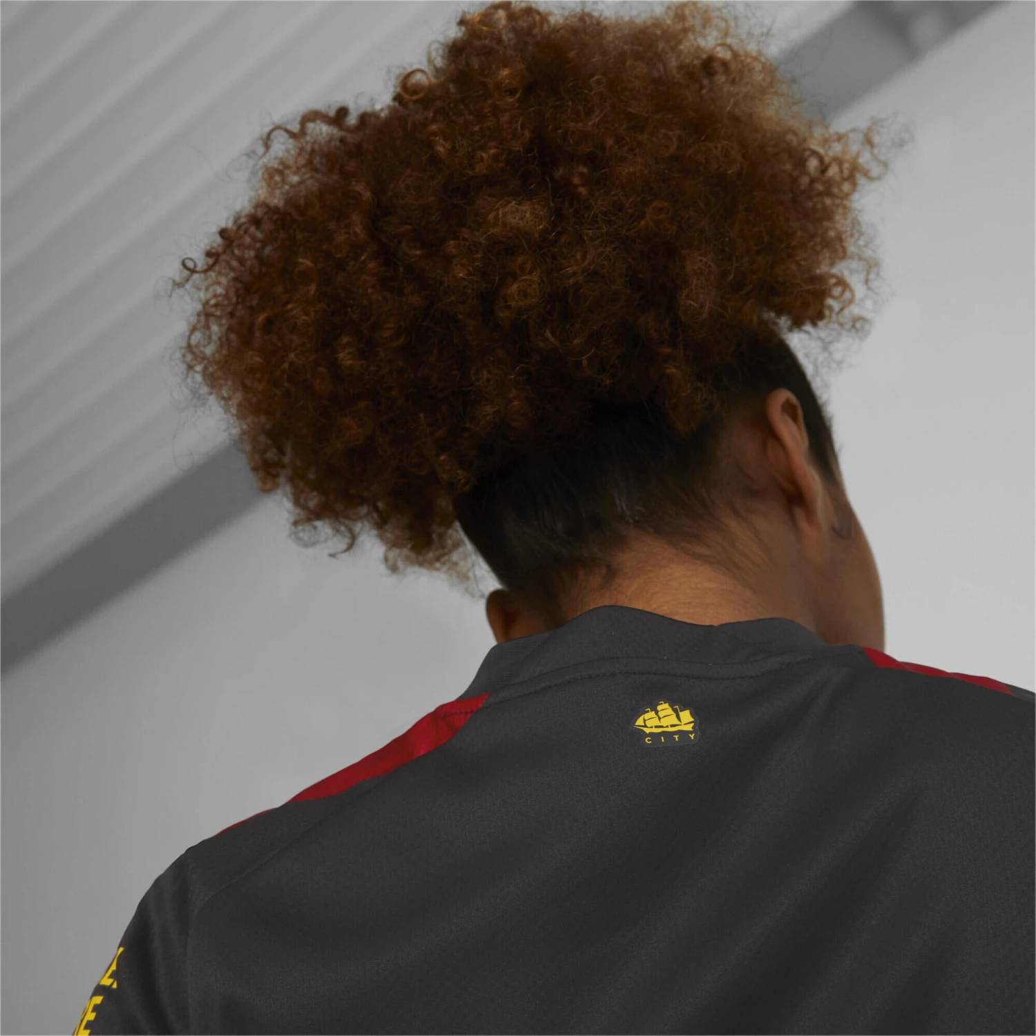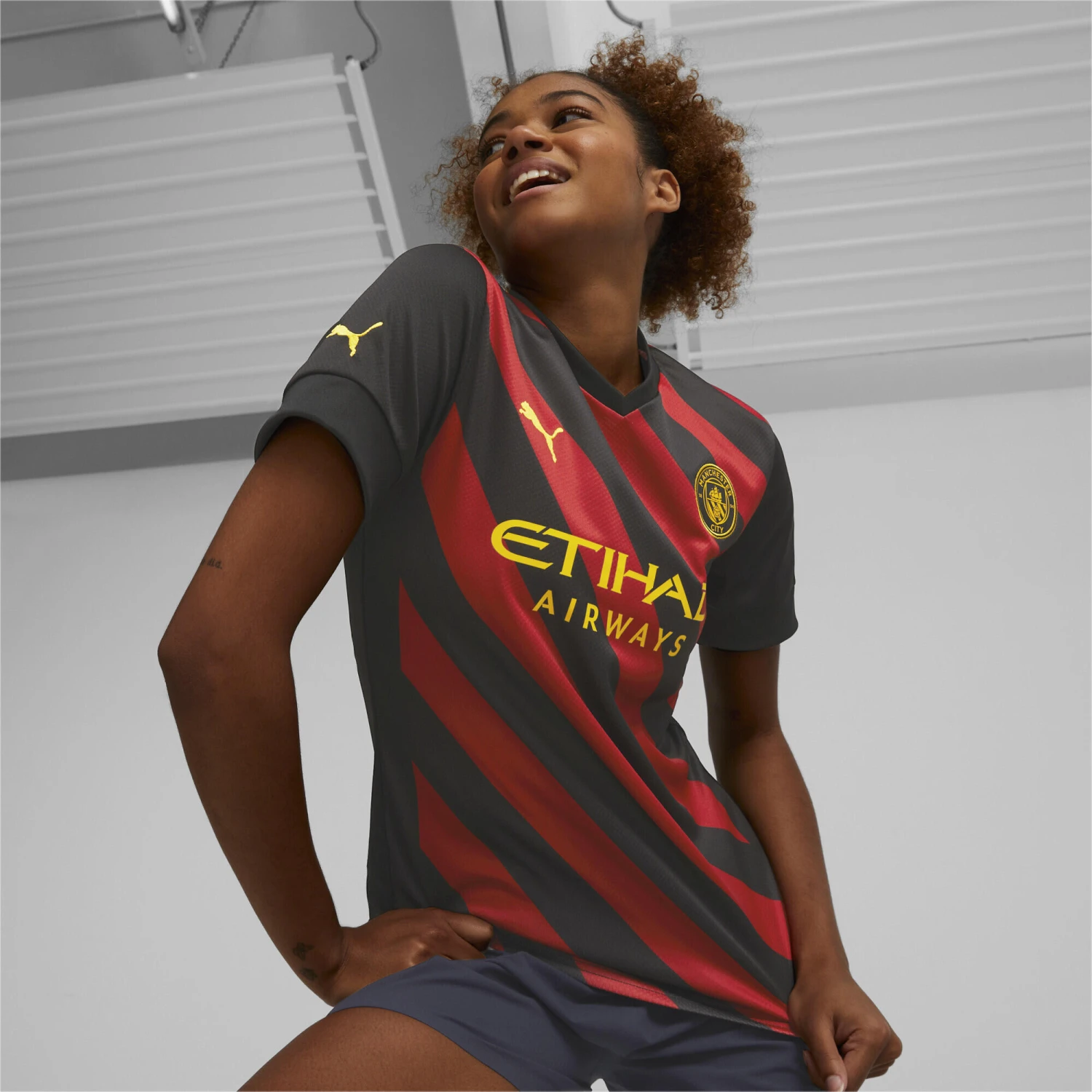 City put on a show. When the class of 1969 took to the road, they turned heads with their fearless, technically adept football and their bold and brilliant new away strip. Conceived by the legendary Malcolm Allison, vertical stripes of red and black proved triumphant at the 1969 FA Cup Final, and the 1970 League Cup and European Cup Winners Cup finals, earning their place among all-time fan favorites. The 2022/23 Manchester City F.C. Away kit breathes new energy into a classic design. For the first time, red and black stripes flow down the jersey at an angle, inspired by the club crest and representation of the three Manchester rivers.